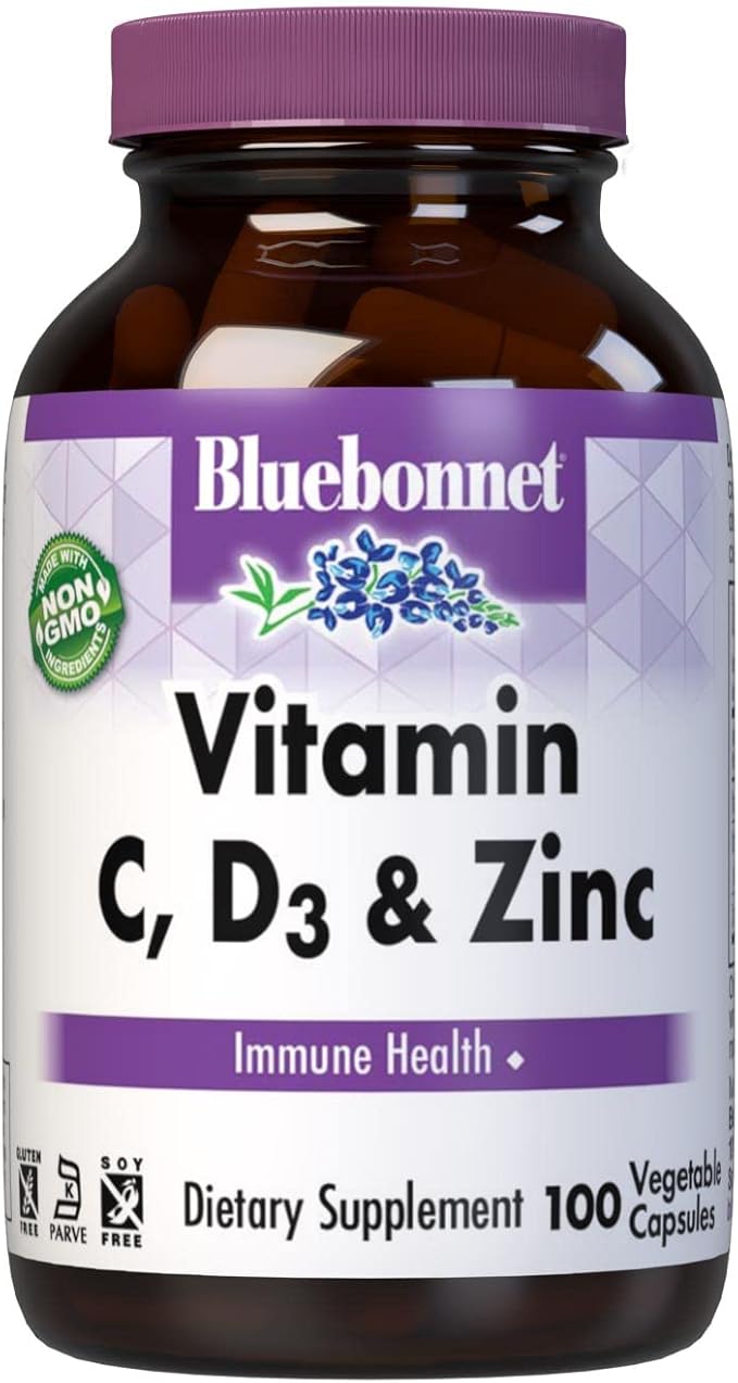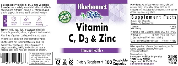 - Primary Supplement Type : Bluebonnet Nutrition Vitamin C, D3 & Zinc, for Immune Health and Respiratory Function*, Soy-Free, Gluten-Free, Non-GMO, Kosher Certified, Dairy-Free, 100 Vegetable Capsules, 100 Servings Bluebonnet Nutrition Vitamin C, D3 & Zinc, for Immune Health and Respiratory Function*, Soy-Free, Gluten-Free, Non-GMO, Kosher Certified, Dairy-Free, 100 Vegetable C… See more
