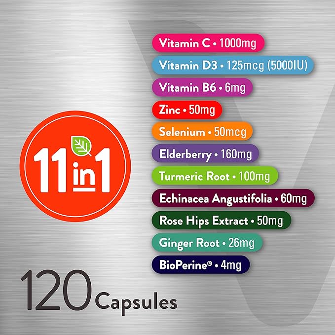 - 120 CAPSULES | 2 MONTH SUPPLY -Each serving contains Vitamin C 1000mg, Vitamin D3 125mcg (5000IU), Vitamin B6 6mg, Zinc 50mg, Elderberry 160mg, Turmeric Root 100mg, Echinacea 60mg, Rose Hips 50mg, Ginger Root 26mg, Selenium 50mcg, & BioPerine 4mg - based on the serving size of 2 capsules. For best results, take 2-4 capsules daily.