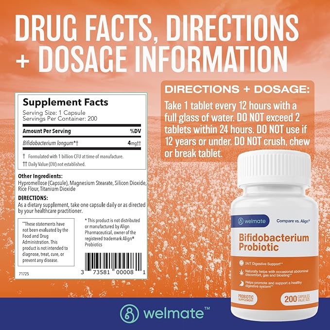 WELMATE Bifidobacterium | Probiotic Supplement | Supports Gut Health | Immune Support | Digestive Enzymes | Gluten Free | Vegan | Men & Womens Probiotic | Value Size | 200 Count
