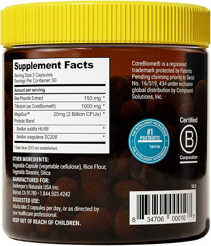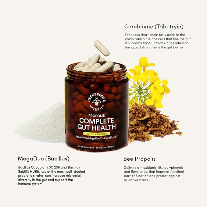 Beekeeper's Naturals Complete Gut Health, 3-in-1 Prebiotic, Postbiotic, Probiotics for Digestive Health & Bloating Relief for Women & Men, Propolis Powered, Gluten-Free Vegan Capsules, 60ct