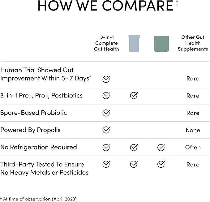 - SUPPORTS & REGULATES DIGESTIVE BALANCE: 3-in-1 Complete Gut Health supports and regulates digestive balance with a triple threat of ingredients including Propolis a prebiotic; MegaDuo, a spore-based probiotic; and CoreBiome a postbiotic.