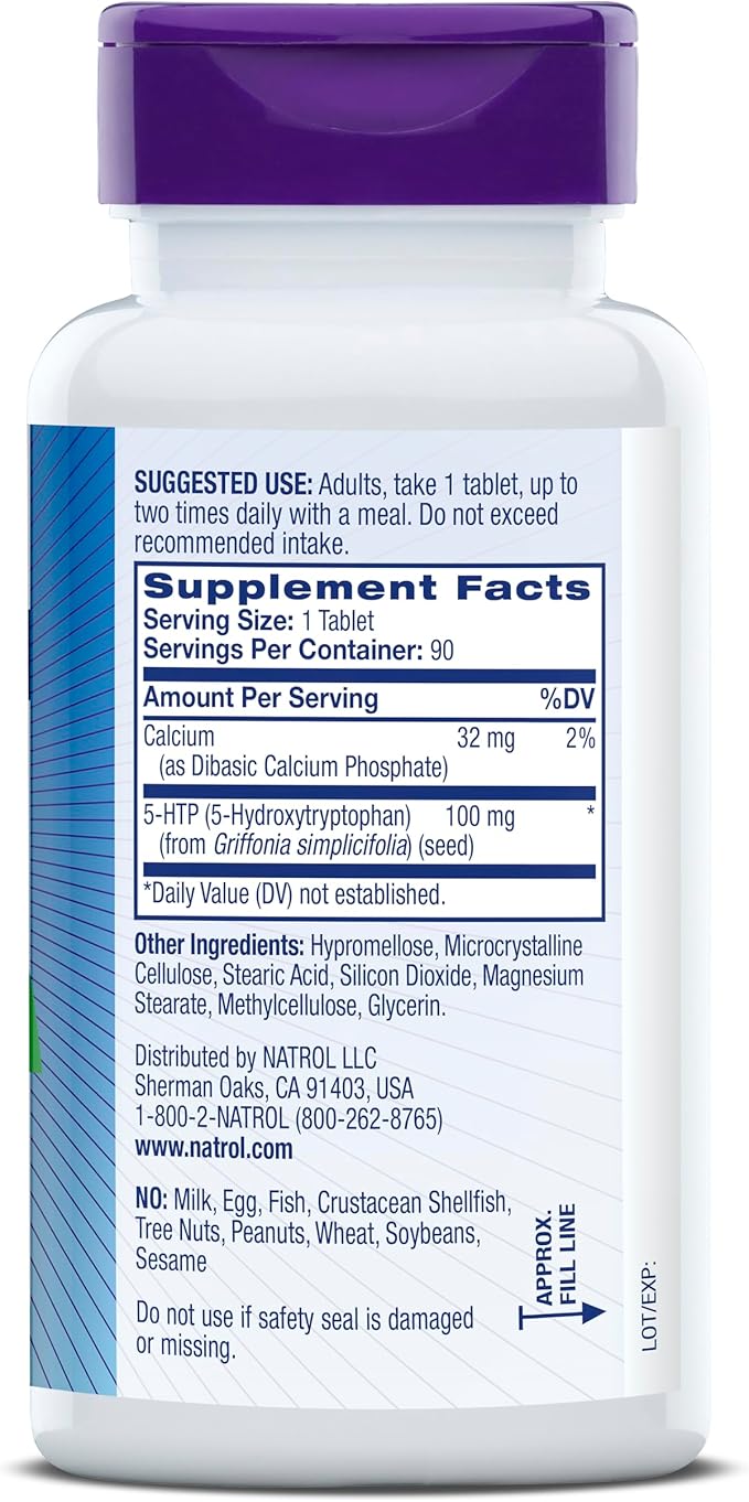 - One (1) 90 count bottle of Natrol 5-HTP 100 mg time release tablets mood support supplement for a 45- to 90-day supply