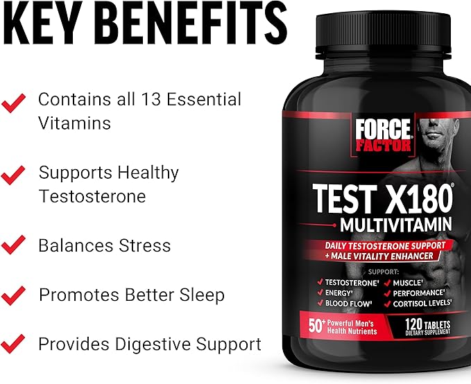 FORCE FACTOR Test X180 Multivitamin for Men Plus Testosterone Support with All 13 Essential Vitamins, for Muscle, Strength, Men’s Health, and Performance, Daily Multivitamin for Adults, 120 Tablets
