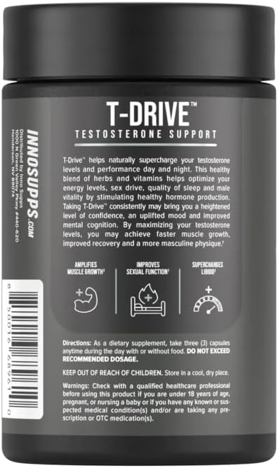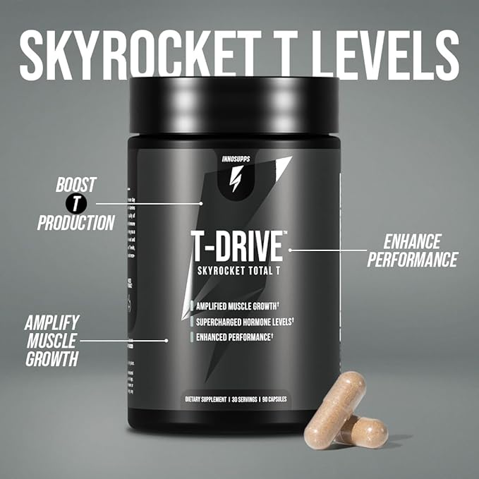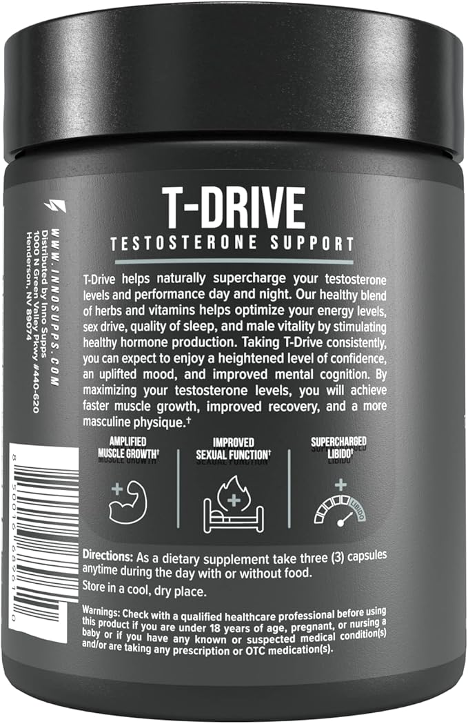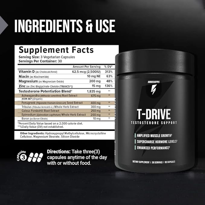 InnoSupps : T-Drive | Testosterone Booster | Amplify Muscle Growth | KSM-66 Ashwagandha, Boron, Fenugreek | 90 Capsules