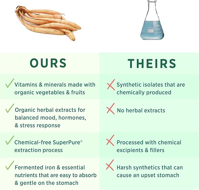 - Product Benefits : Nourish your body and mind with all your essential vitamins, core minerals, plus an energizing and balancing organic herbal blend that includes ashwagandha, shatavari, Peruvian maca, and more. Nourish your body and mind with all your essential vitamins, core minerals, plus an energizing and balancing organic herbal blend that includes ashwagandha, shatavari, Peruvi… See more