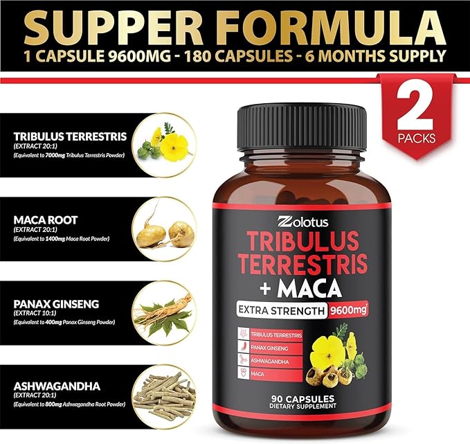 Zolotus 2 Packs Premium Tribulus Terrestris + Maca, 6 Months Supply with Ashwagndha, Ginseng, Boost Energy, Mood, Stamina & Performance, for Men & Women