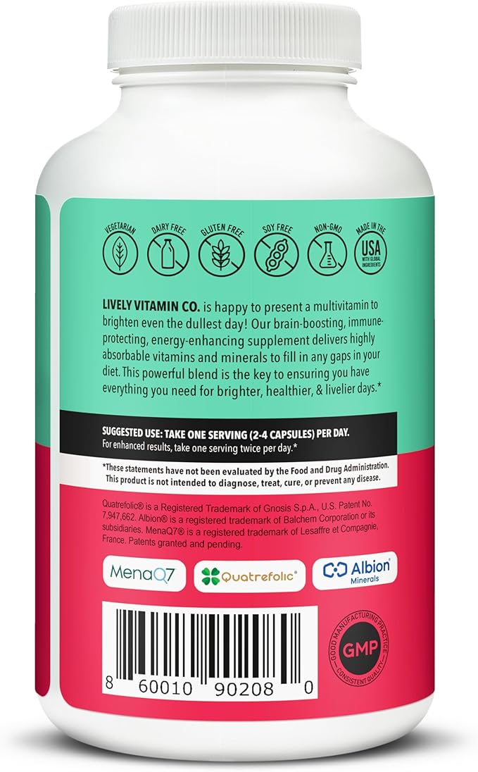 LIVELY VITAMIN CO. Multivitamin - 37 Vitamins Minerals and Extracts - Energy - Memory - Immune Function - Heart- Brain - Focus - Mood - Antioxidants - Dairy Gluten Soy Free - 240 Vegetarian Capsules