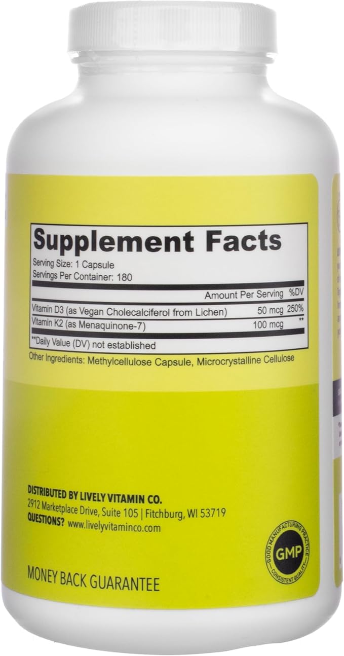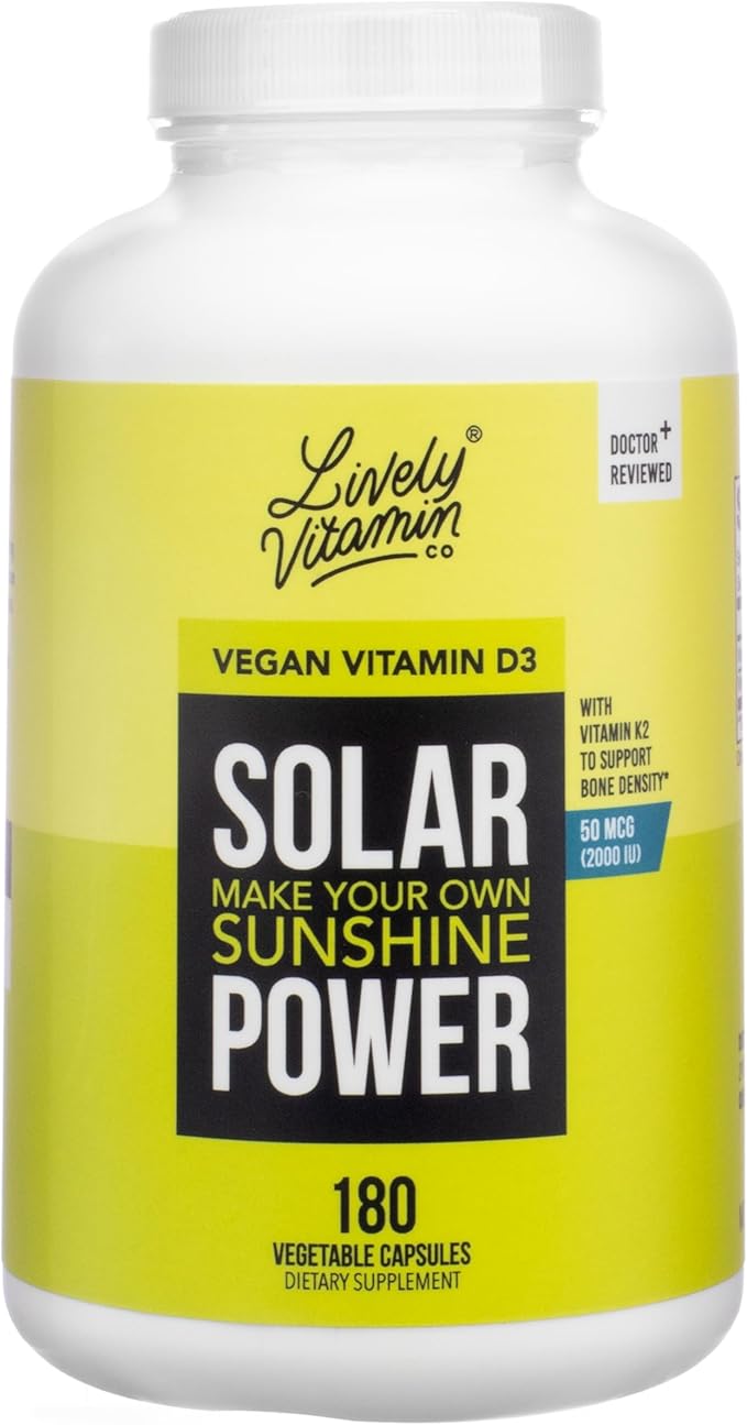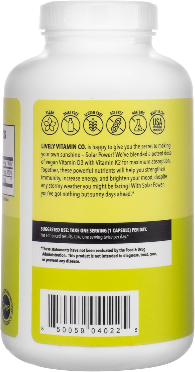 LIVELY VITAMIN CO. Solar Power Vitamin D3 2000 iu - Patented Vitamin K - MK7 - Immune Balance - Brain Function - Mood - Heart - Stress - 180 Count