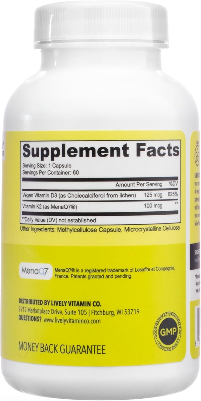 LIVELY VITAMIN CO. Solar Power Vitamin D3 5000 iu - Patented Vitamin K - MK7 - Immune Balance - Brain Function - Mood - Heart - Stress - 60 Count
