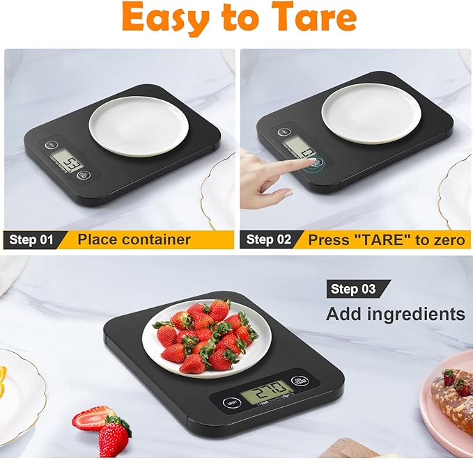 - 【User-friendly Tare Function】 With one-touch tare function, you will no longer trouble with complex steps to get net weight! Only press tare button to remove container weight and get accurate readouts of ingredients. This digital kitchen scale also can continuously tare, make easy to get the exact weight without changing the bowl.