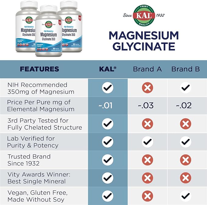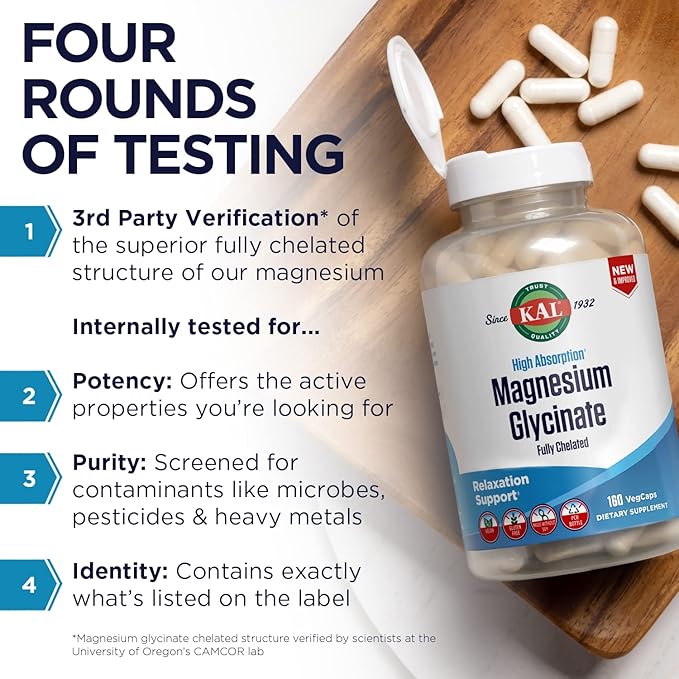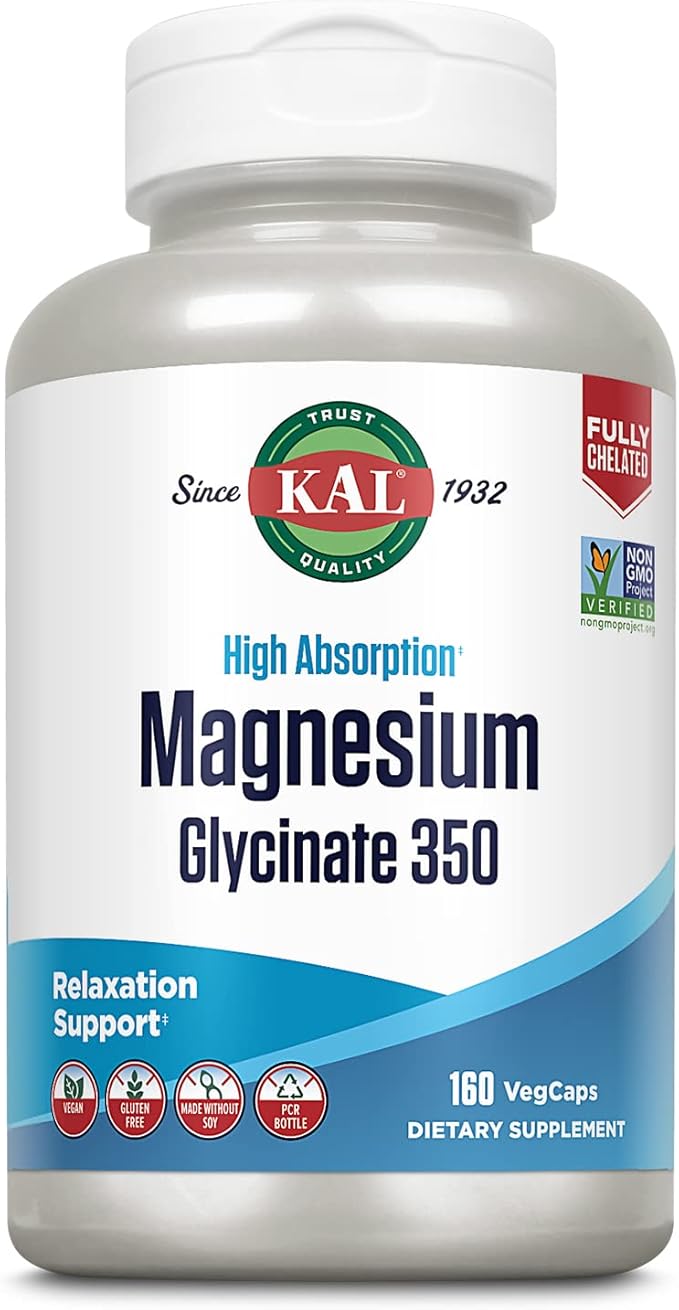 KAL Magnesium Glycinate Capsules, Fully Chelated Magnesium Bisglycinate, High Absorption Magnesium Supplement, Healthy Bones, Muscle, Relaxation and Stress Support, Non-GMO 160 count