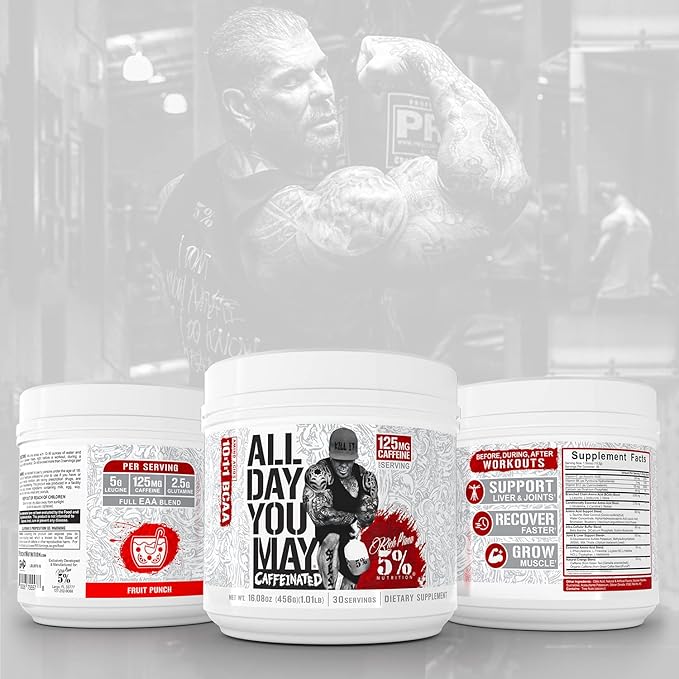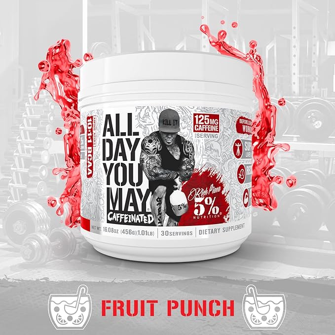 5% Nutrition Rich Piana AllDayYouMay Caffeinated BCAA Energy Powder | Premium Pre Workout Amino Energy & Electrolytes | Hydration, Endurance & Recovery | 16.08 oz, 25 Servings (Fruit Punch)