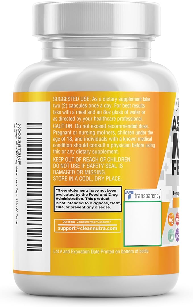 Clean Nutraceuticals Ashwagandha Maca Root Fenugreek Supplement with Tongkat Ali Ginseng - Assists with Stress, Mood & Thyroid - Ashwagandha Capsules Fenugreek Caps - 1 Pack