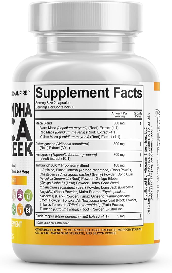 - The Ultimate Ashwagandha Extra Strength with Maca Root Capsules You've Been Looking For - Clean Nutra's Internal Fire provides 3 full-dose Herbal Supplements in one, containing a full Pure Maca Root, Fenugreek Capsules, and Ashwagandha Root in a convenient 2 capsule dosage. Finally, Red Maca Root Capsules for Women and Black Maca Root Capsules For Men have been combined into one solution that also contains a Fenugreek Supplement.