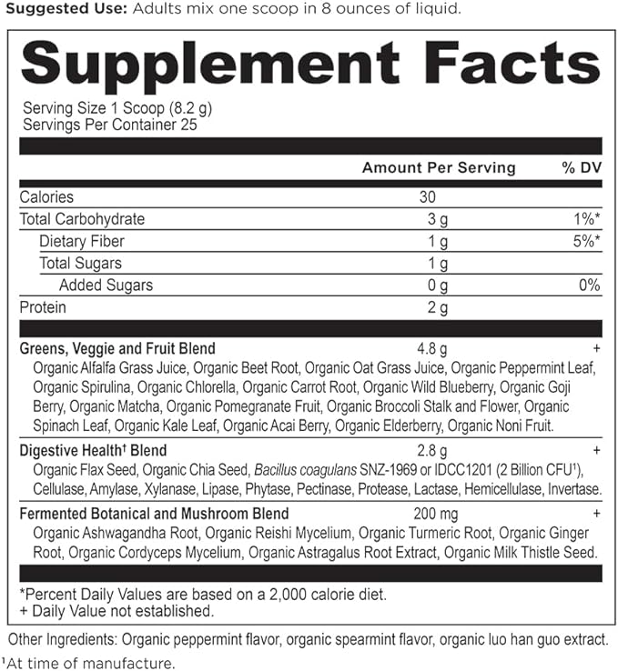 - GREAT TASTING: Get the benefits of juicing every day without the hassle. This greens powder is packed with 25+ antioxidant super fruits, greens, probiotics, enzymes and adaptogenic herbs