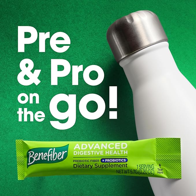 - One 15 count package of Benefiber Advanced Digestive Health Prebiotic Fiber Supplement Powder with Probiotics for Digestive Health (1); Helps Relieve Occasional Bloating