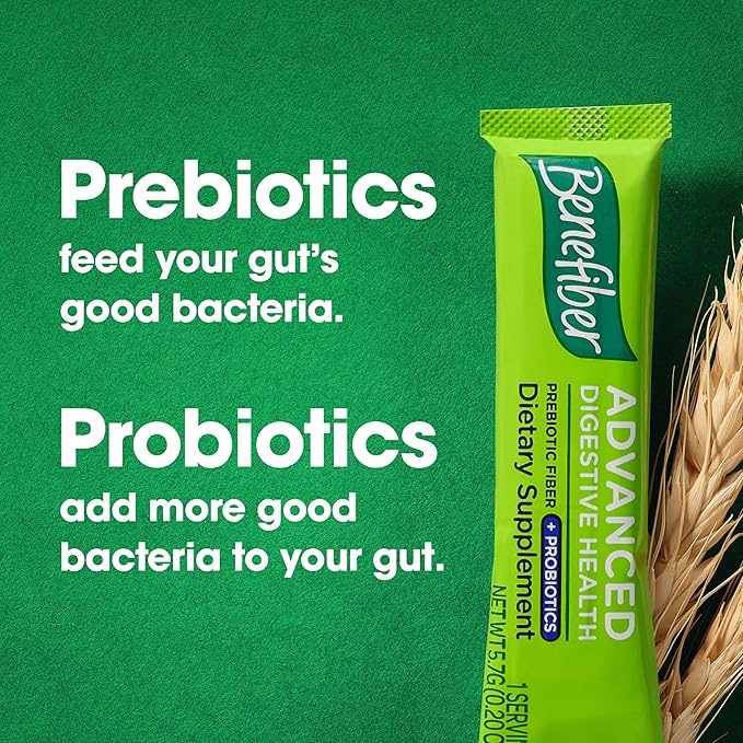 - One 15 count package of Benefiber Advanced Digestive Health Prebiotic Fiber Supplement Powder with Probiotics for Digestive Health (1); Helps Relieve Occasional Bloating
