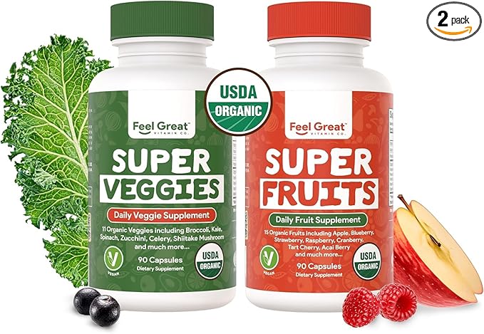 Feel Great USDA Organic Fruit and Vegetable Supplements | 20+ Super Reds & Greens for Natural Energy Support | Vegan Fruit and Veggie Vitamins | 2 Pack of 90 Count