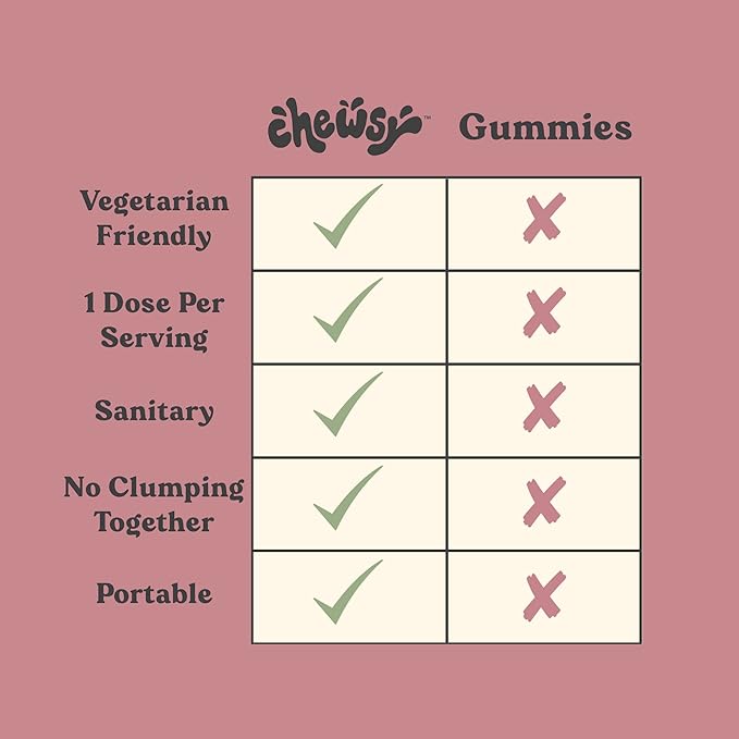 - Smart Packaging: What makes Chewsy truly amazing is the fact that every chew comes individually wrapped, which is a more hygienic and safer alternative. In comparison with traditional gummies, our chews are concentrated and deliver in one dose the equivalent of 2-6 gummies, so our 30-day supply pack is enough to help you achieve your goals