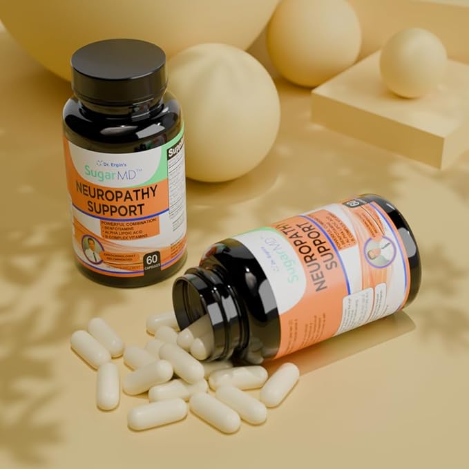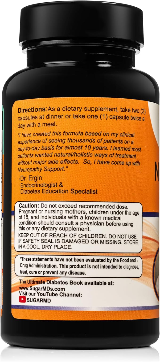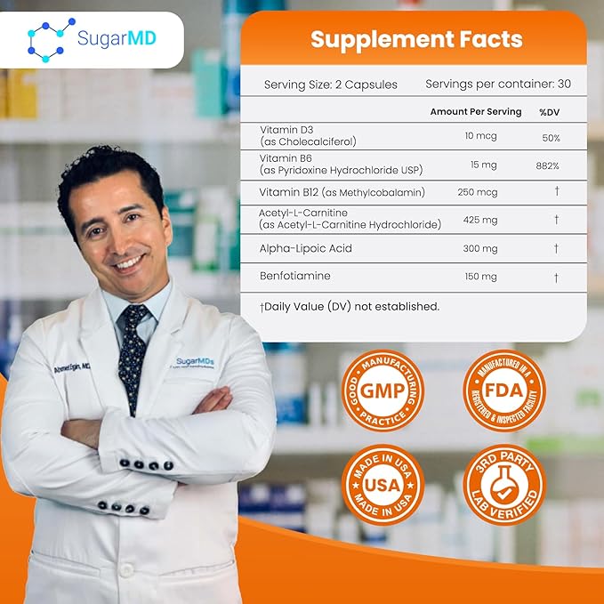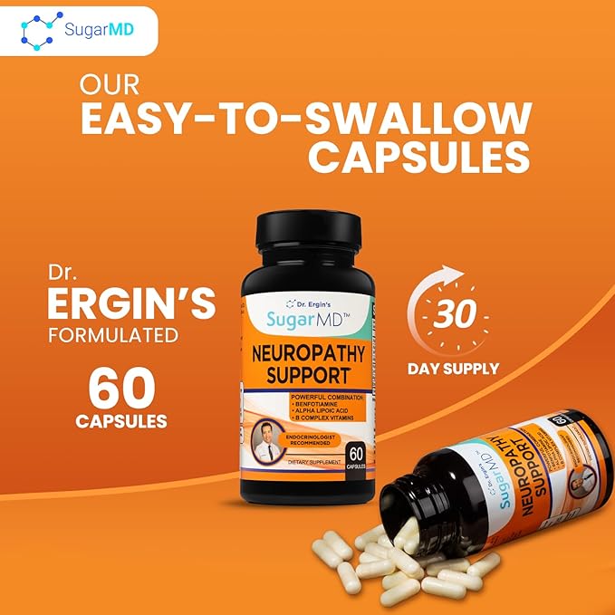 SugarMD Neuropathy Support Supplement โ 60 Nerve Supplement Capsules with Alpha Lipoic Acid, Benfotiamine & Vitamin D3 B6 B12 - Nerve Support Supplement for Feet, Hands, Fingers & Legs - 30 Day Supply