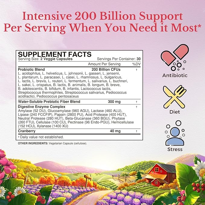- Pro + Pre + Digestive Enzymes + Organic Cranberry: Our 200 Billion Women’s Probiotics is enhanced with organic cranberry extract, plant-based digestive enzymes, and water-soluble prebiotics fiber to help support the gut, immune and vaginal health.* All the ingredients work synergistically to maximize their strength and maintain natural gastrointestinal & urinary tract balance.* Ultra Strength 200 Billion Women’s Probiotic is here for the maximum reinforcement of gut health and vaginal cleanse.*