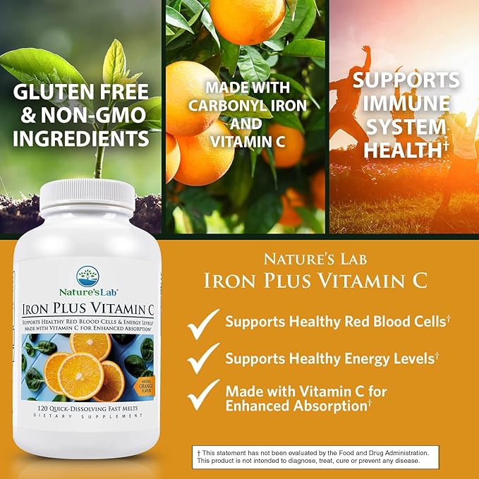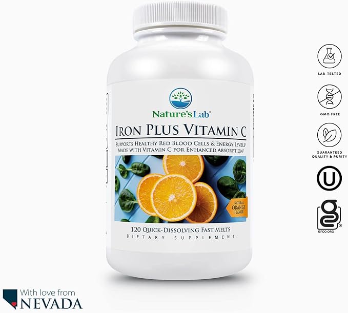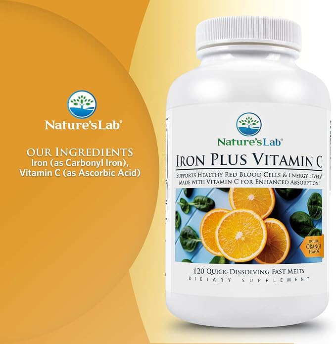 Nature's Lab Iron Plus Vitamin C Fast Melt Tablets - Gentle on the Stomach Carbonyl Iron, High Absorption for Healthy Red Blood Cells* - 120 Tablets