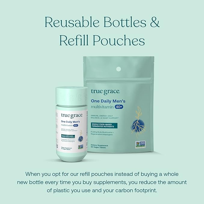 - SUSTAINABLE PACKAGING – Our supplements are delivered in custom-made, reusable bottles made from recycled plastics. We also offer earth-friendly refill pouches made from plant-based materials. Using pouches to refill True Grace bottles minimizes our carbon footprint—and yours. Plus, every time you purchase a bottle or pouch of True Grace products, plastic is pulled out of the ocean through our partnership with ReSea Project.