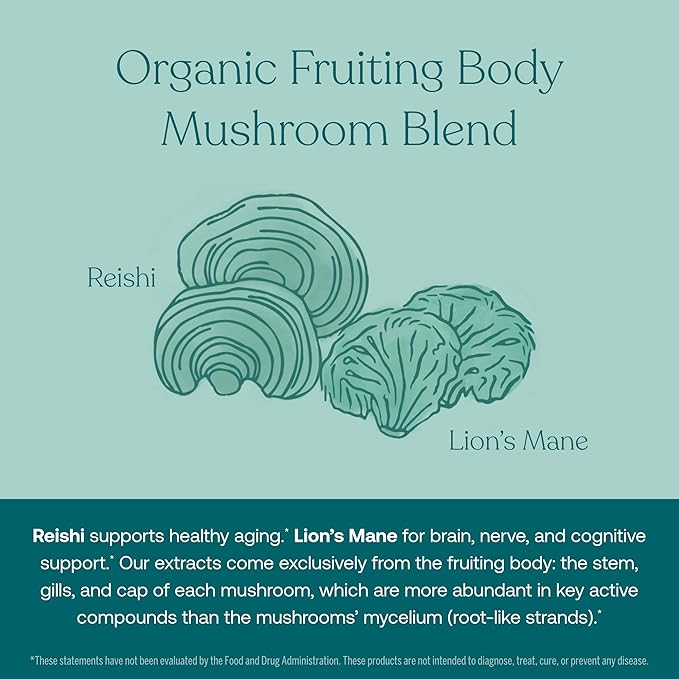 - ORGANIC MUSHROOM BLEND - We use certified organic fruiting body mushroom extracts that are grown naturally on substrate materials native to each mushroom. Extracted to improve bioavailability, no grain fillers, and provides beta glucans and other compounds that support your health. Reishi supports healthy aging, Maitake and Turkey Tail support immunity, and Cordyceps support endurance which support an active lifestyle.