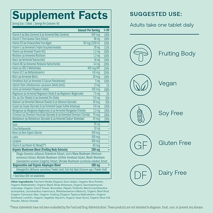 True Grace Men's 40+ One Daily Multivitamin Fermented Minerals, Organic Adaptogens & Mushrooms Whole Body Balance Immune, Endurance, Bone & Heart Support Supplement - Non-GMO - 60 Vegan Tablets