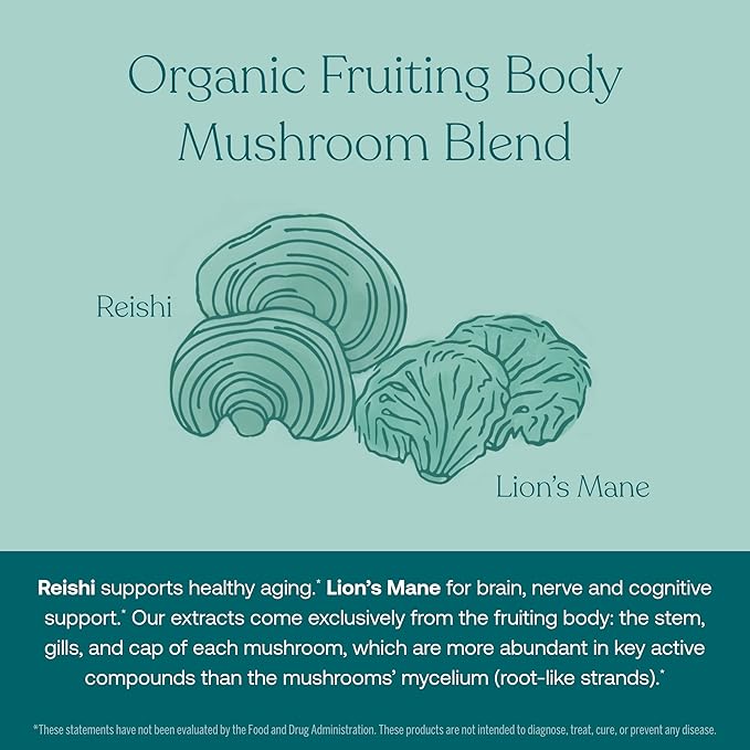 - ORGANIC MUSHROOM BLEND - We use certified organic fruiting body mushroom extracts that are grown naturally on substrate materials native to each mushroom. Extracted to improve bioavailability, no grain fillers, and provides beta glucans and other compounds that support your health. Reishi supports healthy aging, Maitake and Turkey Tail support immunity, and Cordyceps support endurance which support an active lifestyle.