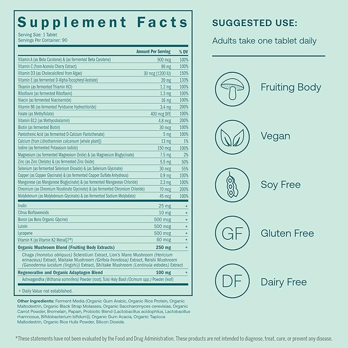 True Grace Men's 40+ One Daily Multivitamin Fermented Minerals, Organic Adaptogens & Mushrooms Whole Body Balance Immune, Endurance, Bone & Heart Support Supplement - Non-GMO - 90 Vegetarian Tablets