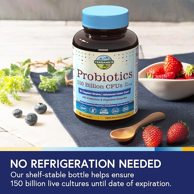 - Delayed Release & Shelf Stable: Each vegan capsule of Terranics Colon Care probiotics is scientifically made to give probiotics an added edge and the vitality needed to survive acid & bile so they can make it to your small intestine and colon. Our shelf-stable bottle helps ensure 150 billion live cultures throughout expiration. No refrigeration required.