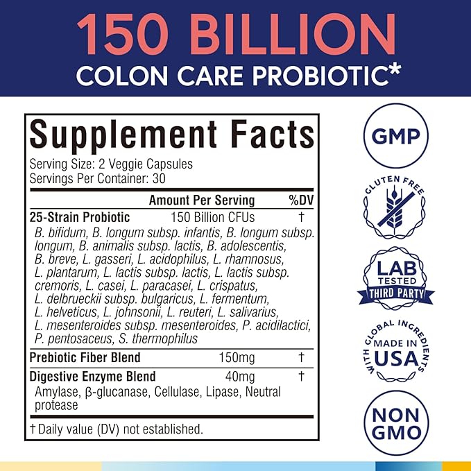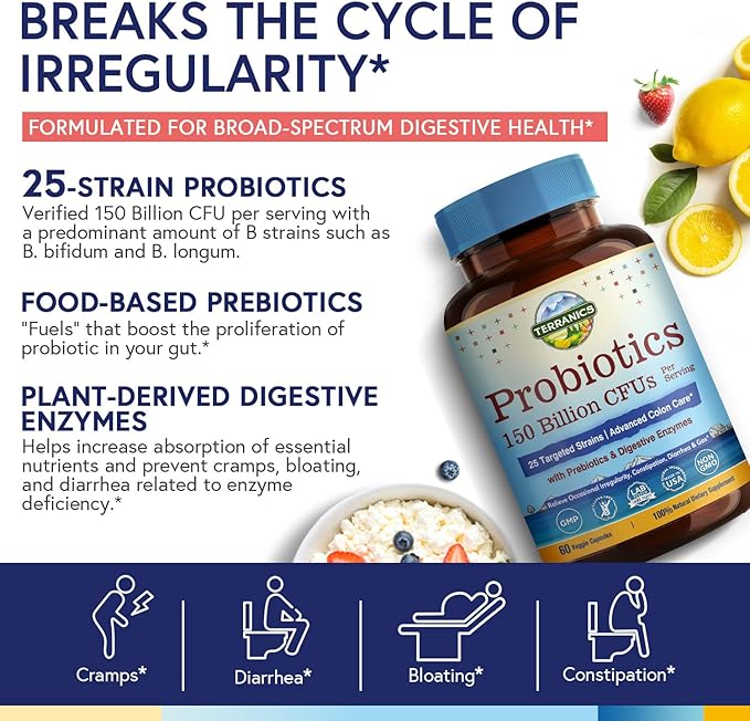 - Colon-Specific Formula*: Not all probiotics are created equal. Terranics colon care probiotics boasts 150 Billion CFU with a predominant amount of B strains such as B. bifidum and B. longum to deliver intensive colon care for adults of all ages and life stages.* 25-strain pro + prebiotics mirror & restore your colon balance while full-spectrum enzymes are included to increase absorption of essential nutrients and relieve occasional cramps, bloating, and diarrhea related to enzyme deficiency.*
