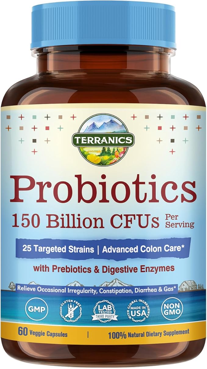 Terranics Daily Probiotics for Men & Women, 150 Billion 25 Strains Colon Care Probiotics, with Prebiotics & Enzymes, Healthy Regularity, Delayed Release, Shelf Stable, 60 Veggie Caps