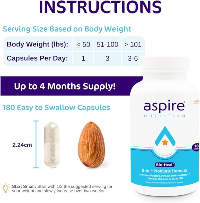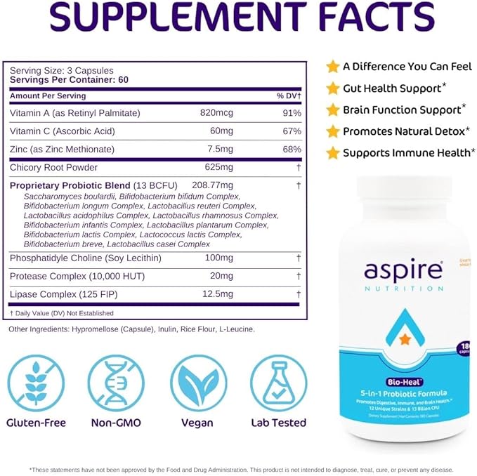 - IMMUNE SUPPORT - 70% of your immune system is in your gut. Aspire Nutrition's Bio-Heal helps replenish beneficial bacteria to support immune health, digestive and intestinal health, gut health, and constipation.