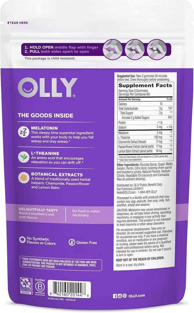 - OLLY SLEEP GUMMIES: Our Melatonin gummies, with L-Theanine and Botanical Extracts, work with your body to help you fall asleep and stay asleep*