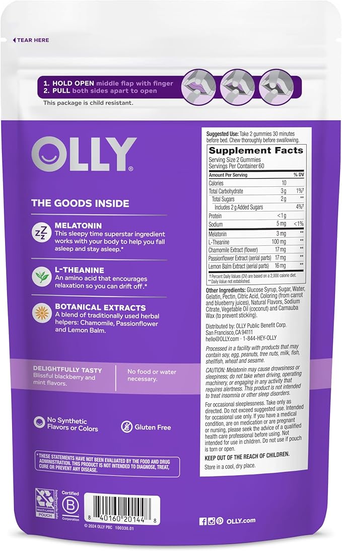 OLLY Sleep Gummy, 3 mg Melatonin, L-Theanine, Chamomile, and Lemon Balm Extracts, BlackBerry Flavor, 60 Day Supply - 120 Count (Packaging May Vary)