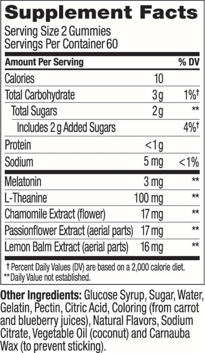 - THE GOODS INSIDE: Featuring 3mg of Melatonin, a sleepy time superstar ingredient that helps you fall and stay asleep. L-Theanine supports calmness & Botanicals like Chamomile, Passionflower & Lemon Balm Extracts have been used for centuries*