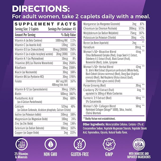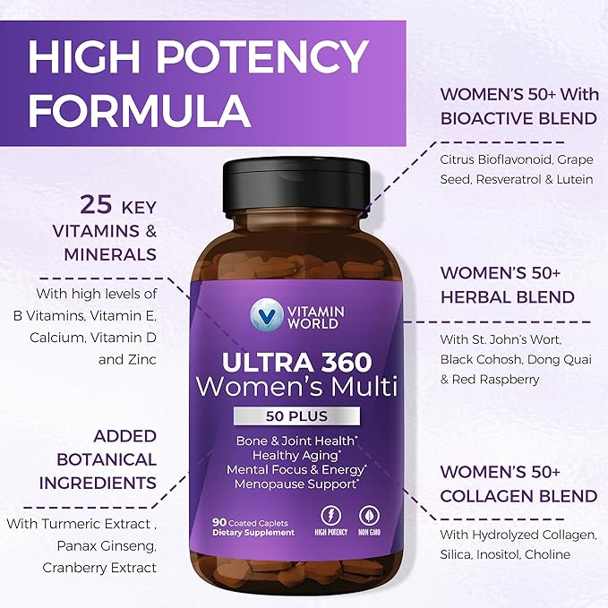 - WELL-ROUNDED MULTI FOR WOMEN 50+: ULTRA 360 Women’s Multi 50+ features 25 key vitamins and minerals plus herbs including Vitamin A, C, D, E, B-complex, Biotin & Zinc for women's 50+ wellness support;* Women 50+ should take two caplets daily with a meal