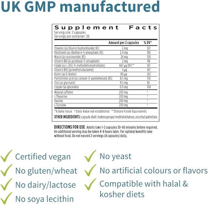 Focus - Methylated Nootropic with 200mg Natural Caffeine, Active B Vitamins, L-Theanine, Taurine, L-Tyrosine, Clean Energy, Brain Booster & Cognitive Performance, Non Jittery, 60 Capsules, by Igennus