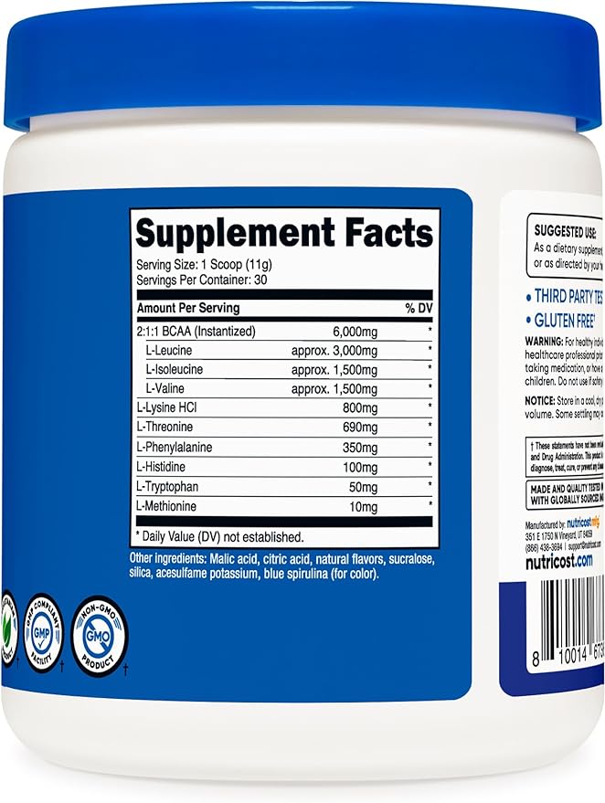- Nutricost Blue Raspberry EAA Powder has an optimum blend of essential amino acids and contains 8g of EAAs in every serving, 30 servings per container.