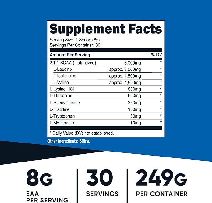 - Nutricost EAA Powder has an optimum blend of essential amino acids and contains 8g of EAAs in every serving, 30 servings per container.