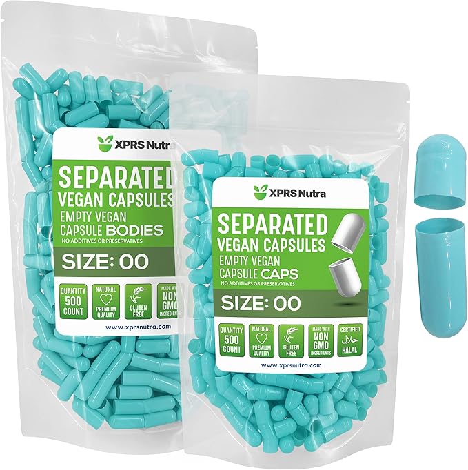 XPRS Nutra Vegan Size 00 Separated Capsules - 500 Count Premium Empty Capsules Separated in Bags - Separated Empty 00 Capsules - Pill Capsules Empty for DIY Supplement Filling (Aqua)