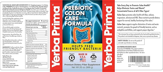 Yerba Prima Prebiotic Colon Care Formula, 20 oz Powder (Pack of 2) with FOS - Natural Psyllium Fiber, Magnesium, Selenium - Non-GMO, Gluten Free, Vegan Daily Supplement - for Men & Women