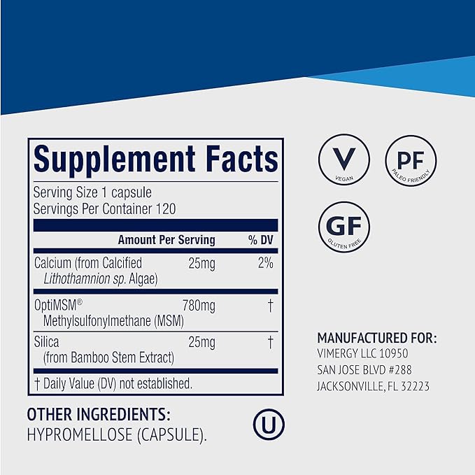 Vimergy MSM with Silica + Calcium Capsules, 120 Servings – Supports Bone Health – Promotes Hair & Nail Health – Non-GMO, Gluten-Free, Kosher, Soy-Free, Corn-Free, Vegan & Paleo Friendly