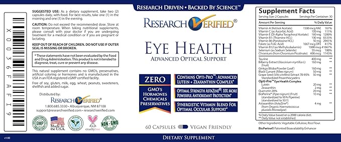 Research Verified Eye Health - Nourish and Protect Eyes and Vision, Support Healthy Retina, Improve Blood Supply to Eyes - Vitamins A, B, C, and E - 60 Capsules - Made in The USA