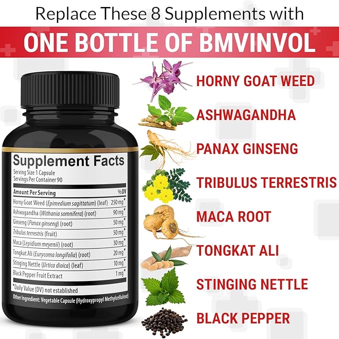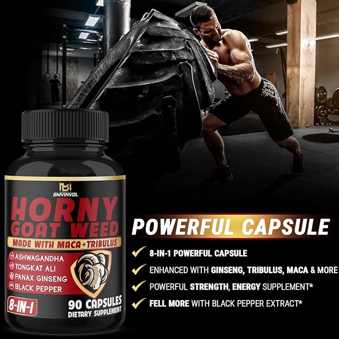 BMVINVOL Horny Goat Weed Capsules with Maca, Ginseng, Tribulus Terrestris, Ashwagandha, Black Pepper - 90 Count for 3 Month Supply