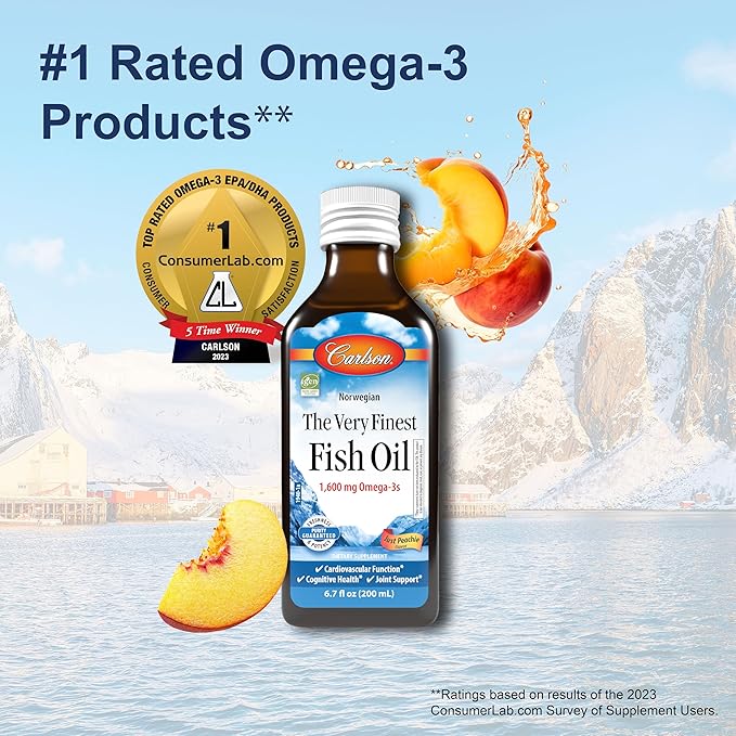 Carlson - The Very Finest Fish Oil, 1600 mg Omega-3s, Liquid Fish Oil Supplement, Norwegian Fish Oil, Wild-Caught, Sustainably Sourced Fish Oil Liquid, Just Peachie, 200 mL (6.7 Fl Oz)