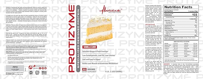 Metabolic Nutrition, Protizyme, 100% Whey Protein Powder, High Protein, Low Carb, Low Fat Whey Protein, Digestive Enzymes, 24 Essential Vitamins and Minerals, 4 Pound (52 ser)
