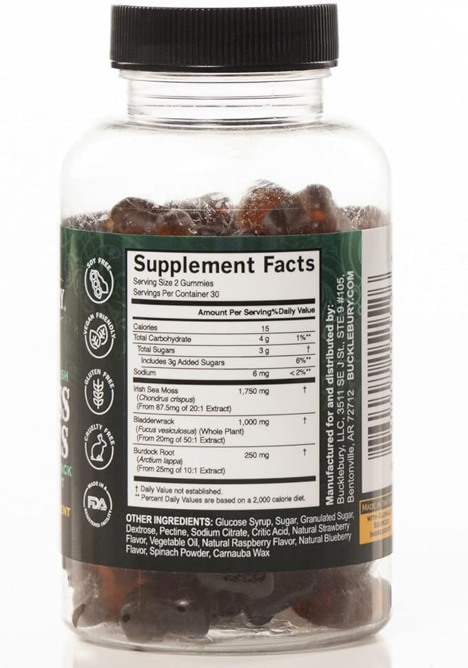 - YUMMY CHEWABLE GUMMIES - Bucklebury Irish Sea Moss gummies have a yummy mixed berry flavor. These fruity chewable vegan gummies absorb faster than pills. Each bottle comes with 60 sea moss gummies